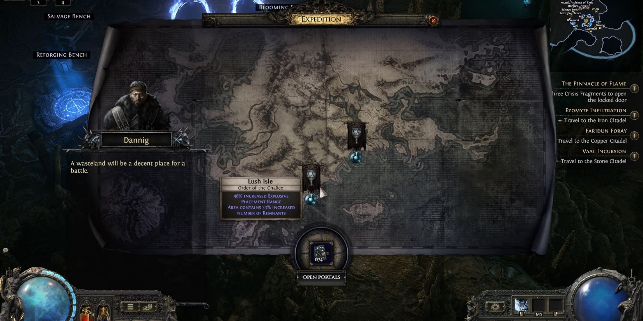 Качество журнала экспедиции определяется уровнем карты, с которой он получен. Например, использование Путистоуна уровня 10 может дать журнал уровня 74, но предпочтительнее получить журнал уровня 79 с помощью Путистоуна уровня 15. Если на карте присутствует модификатор «Corrupted» или «Irradiated», её уровень автоматически увеличивается на +1 или +2 соответственно. В таких случаях вы можете успешно использовать Путистоуны уровней 13 или 14 для достижения того же результата.