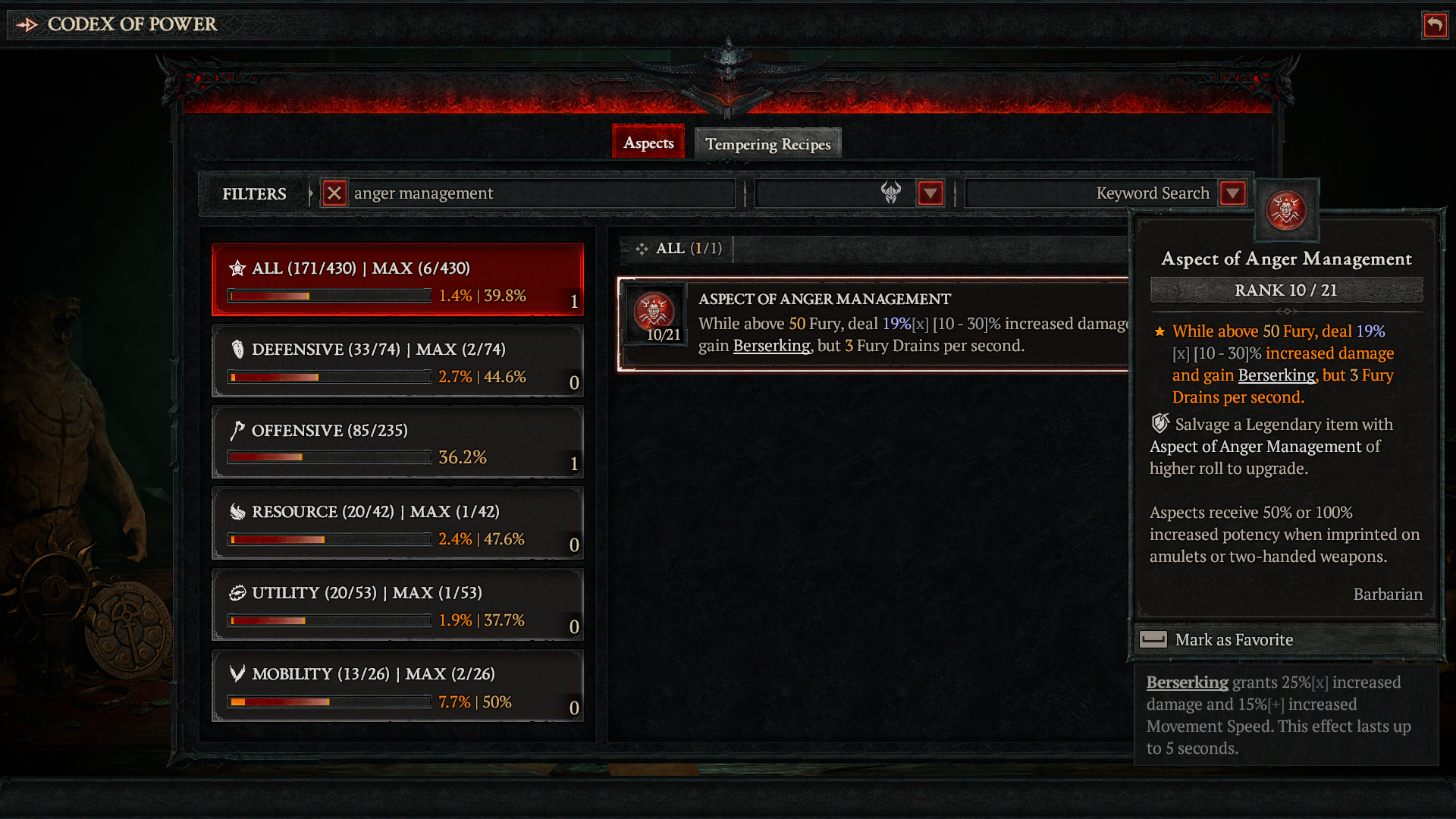 Мы рекомендуем всегда держать Аспект Управления Гневом на ваших перчатках, а затем размещать другие два аспекта на вашем одноручном оружии. Таким образом, вы сможете улучшать ваше двуручное дробящее и рубящее оружие, не переприменяя снова и снова эти мощные легендарные эффекты.