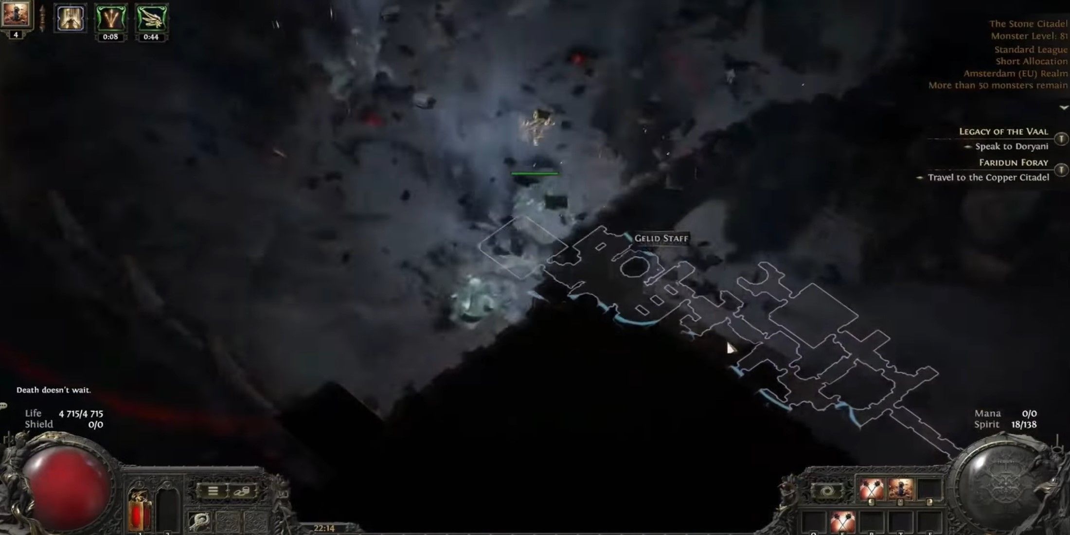 По своей сути эта сборка колдуньи в основном сосредоточена на нанесении урона способностью Spark. Однако то, что отличает её как оптимальную для эндгейма конфигурацию, — это улучшенная выживаемость за счет синергии между навыками Time Freeze и Time Snap. Эти умения принадлежат классу Chronomancer, чтобы получить доступ к обоим, нужно инвестировать все восемь очков восхождения. Time Freeze оказывает сильное воздействие: он временно останавливает время у пораженных врагов. В свою очередь, Time Snap полезен для сброса перезарядки ваших способностей, что позволяет вам использовать оба навыка последовательно. Так вы сможете держать противников замороженными во времени до их гибели.
