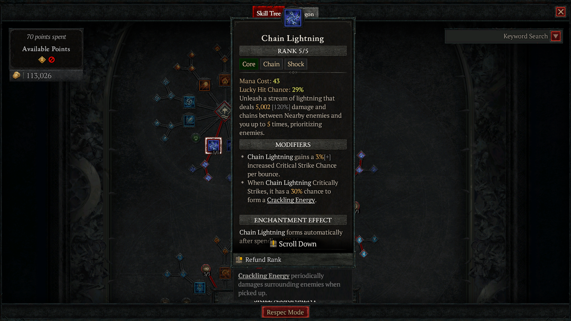 При создании чар для вашего Волшебника, сосредоточьтесь на Spark, чтобы создать дополнительную Crackling Energy и более частые атаки Chain Lightning. Если вы предпочитаете максимизировать Crackling Energy, вы можете заменить Chain Lightning на Lightning Spear.