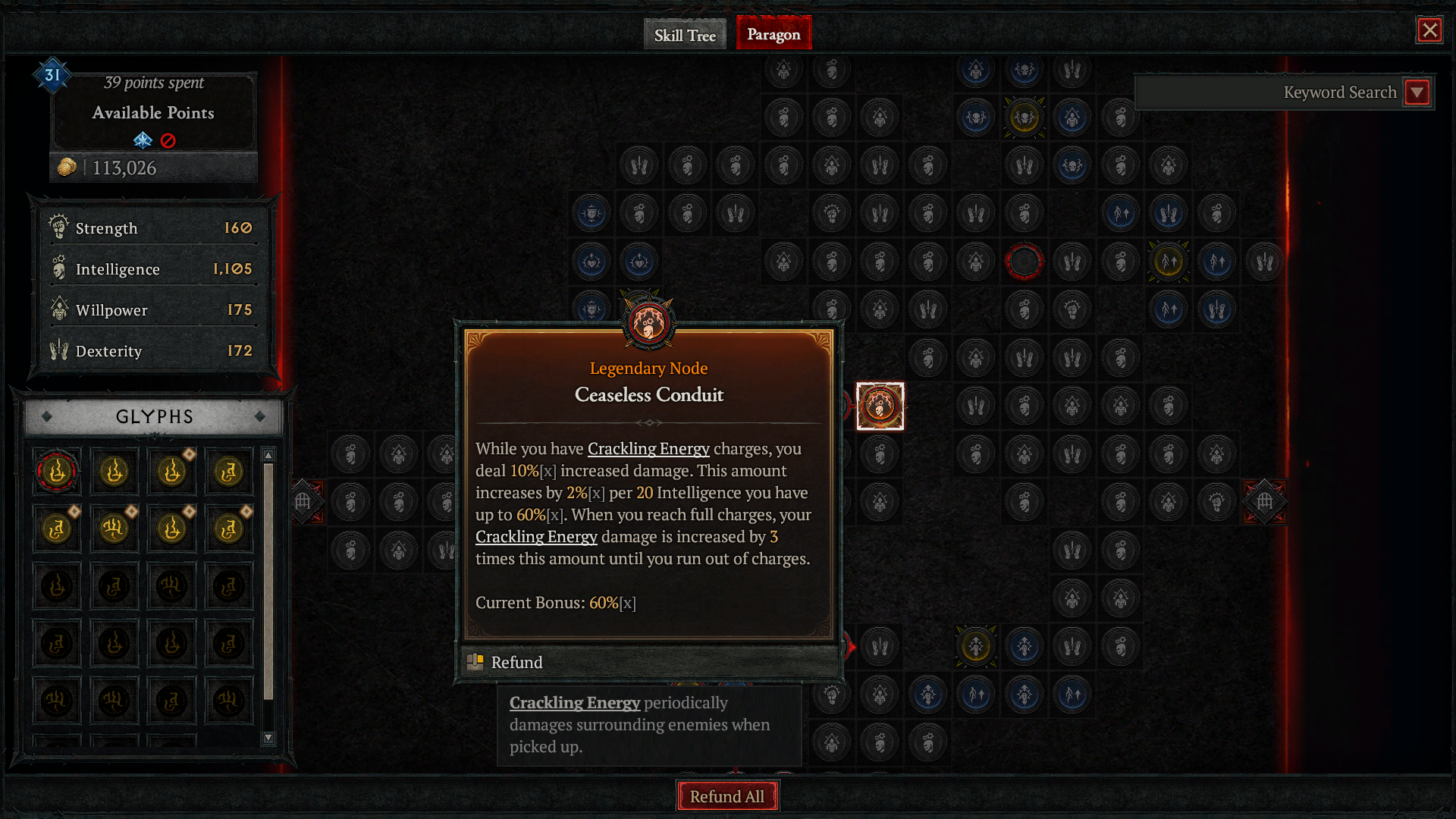 После установки платы Ceaseless Conduit быстро переместитесь к Legendary Node, чтобы значительно увеличить свой урон, когда активна Crackling Energy. Затем переместитесь к Glyph node и вставьте её для улучшения критических ударов.