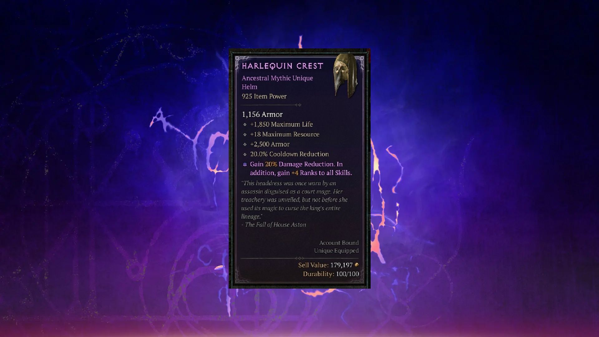 Diablo 4 Сезон 10 Волшебники могут в полной мере воспользоваться мифическим шлемом Harlequin Crest.